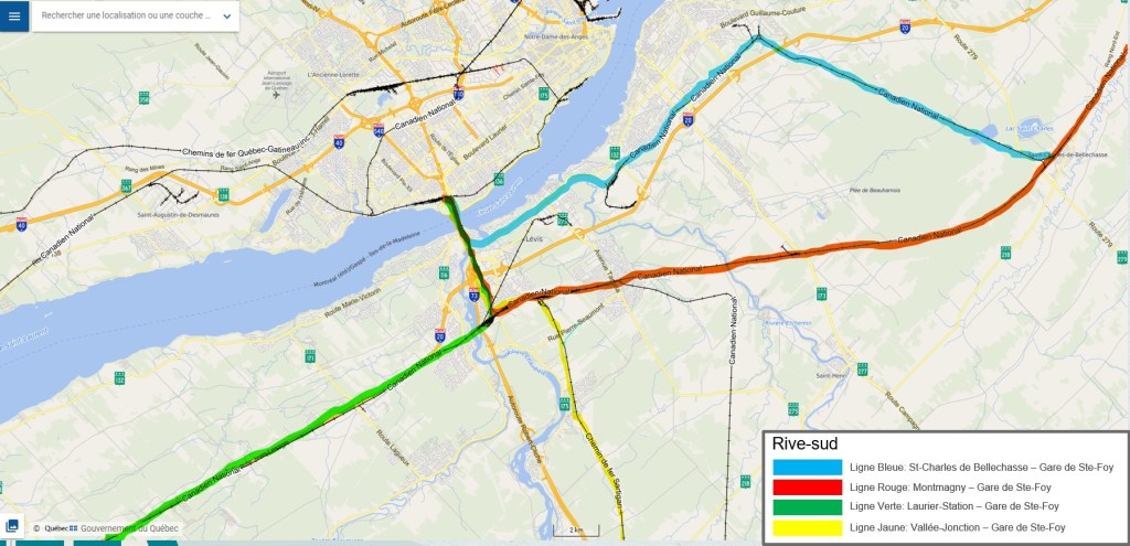 Le tracé de la Rive-Sud comprendrait 4 lignes desservant d’est en ouest toute la rive-sud ainsi qu’une partie de la Beauce.